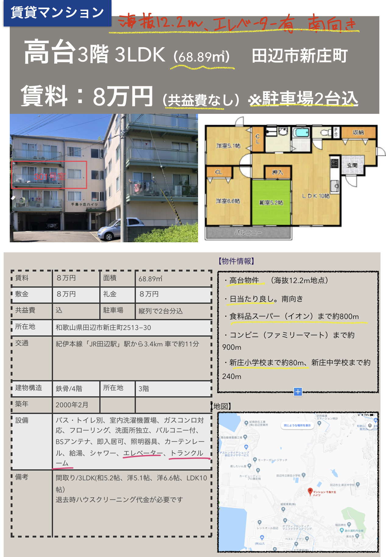 ← 【おすすめ賃貸マンション】3LDK(68.89㎡)月7.5万(共益費なし)駐車場2台込